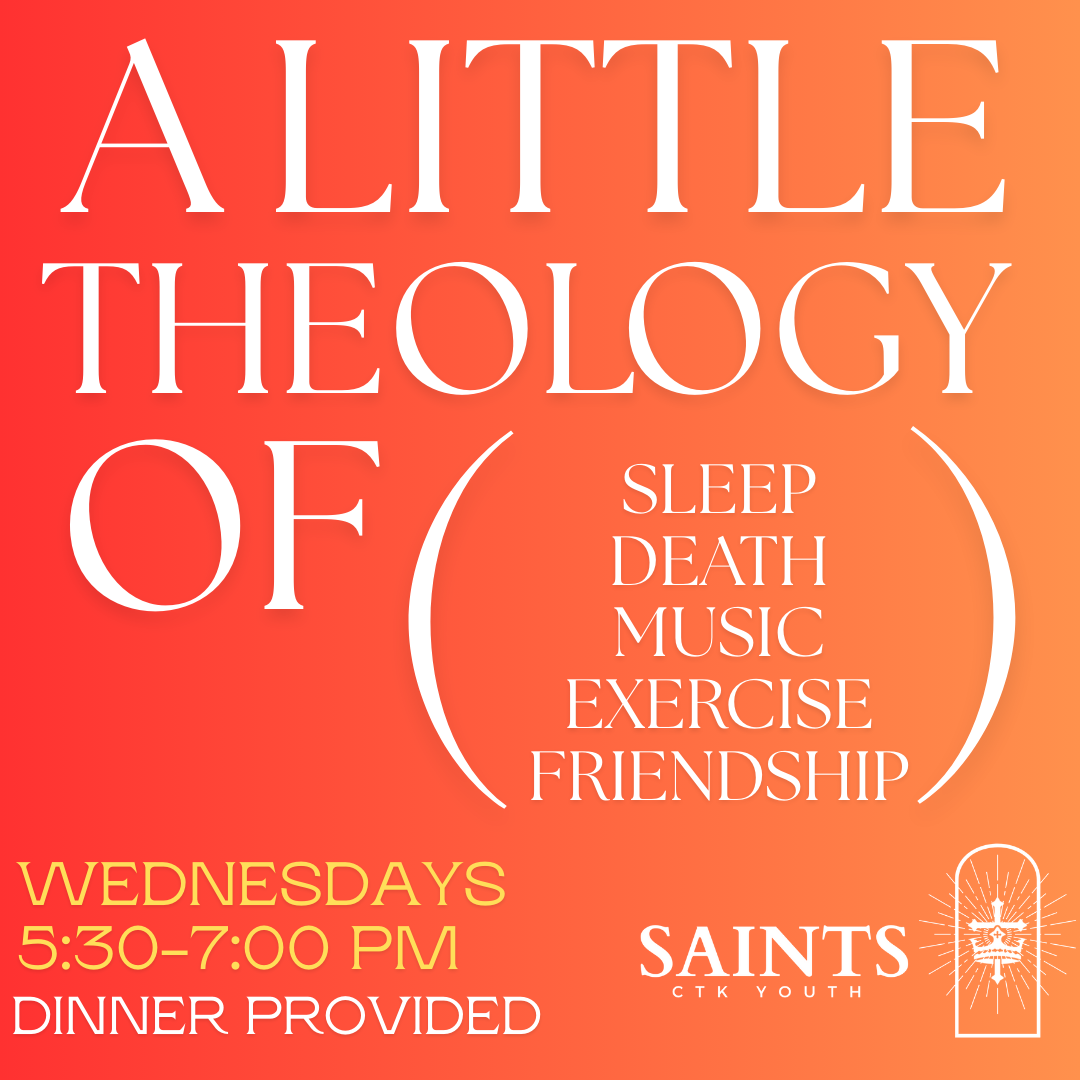 We gather in the Youth Room (bottom floor of the Ed Building) and begin at 5:30pm with prayer & dinner & time to socialize & play games. We then have a time of Bible teaching, followed by dinner & discussion in small groups (boys/girls) led by male and female Saints leaders. Our present series presents little biblical theologies of commons parts of human life. What does the Bible teach us about sleep, death, music, exercise, and friendship? Dinner provided!